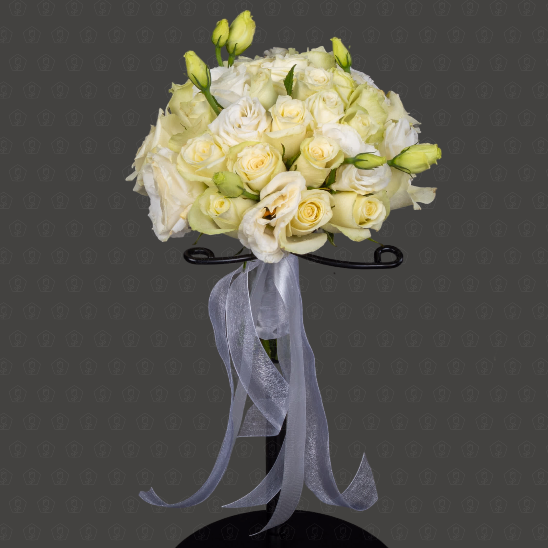 Этот букет невесты создан для самой любимой. В нем сплелись нежность миниатюрных белых роз, словно утренние капли росы, и утонченная красота эустомы. Двуслойная атласная лента мягко струится каскадом, добавляя завершающий штрих этой воздушной композиции.