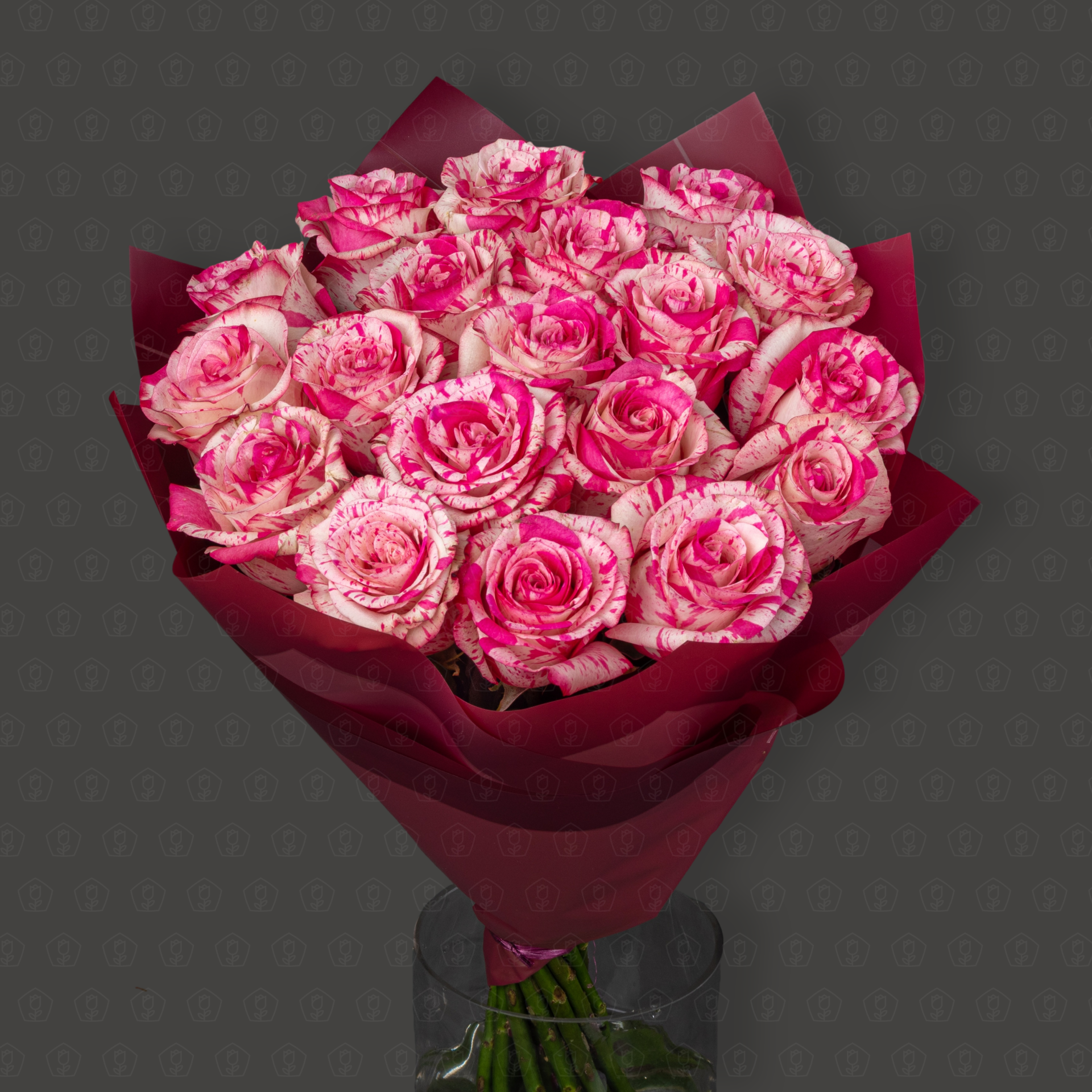 Двухцветные розовые розы в этом букете создают потрясающий визуальный эффект, переливаясь от нежного до насыщенного оттенка. Это как наблюдать за закатом, который каждый раз удивляет своей красотой