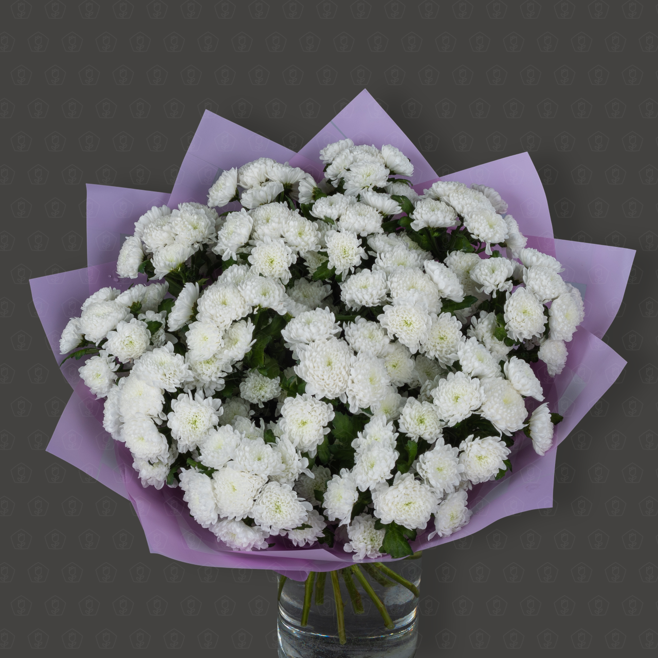 Пятнадцать кустовых хризантем Сантини – каскад нежности, собранный в спиральной технике , что позволяет каждому цветку раскрыться во всей своей красе, создавая объемный и пышный букет. Трендовая корейская пленка окутывает букет, подчеркивая его нежность и хрупкость. И завершающим штрихом является изысканная атласная лента, струящаяся водопадом элегантности. Она связывает все элементы букета в единое целое, добавляя роскоши и шарма.