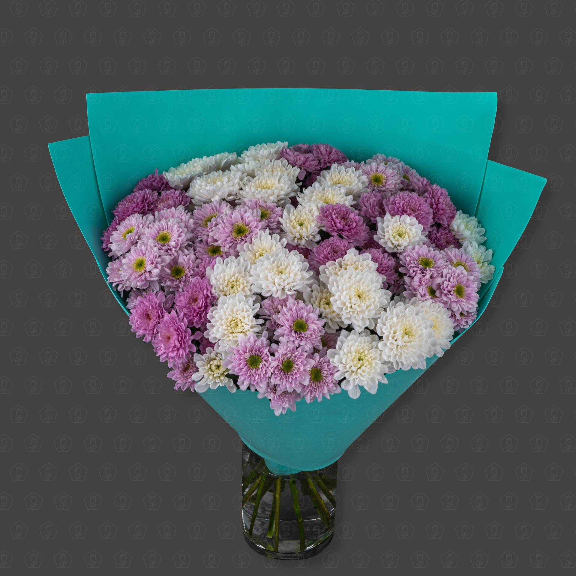 Представляем вам великолепный букет из 15 хризантем, собранный по спиральной технике. Такая сборка придает ему объем и элегантность. Букет оформлен в трендовую упаковку фоамиран, которая подчеркивает свежесть и красоту цветов. Для завершающего штриха использованы две ленты: практичная техническая лента и изысканная атласная лента, добавляющая изящества