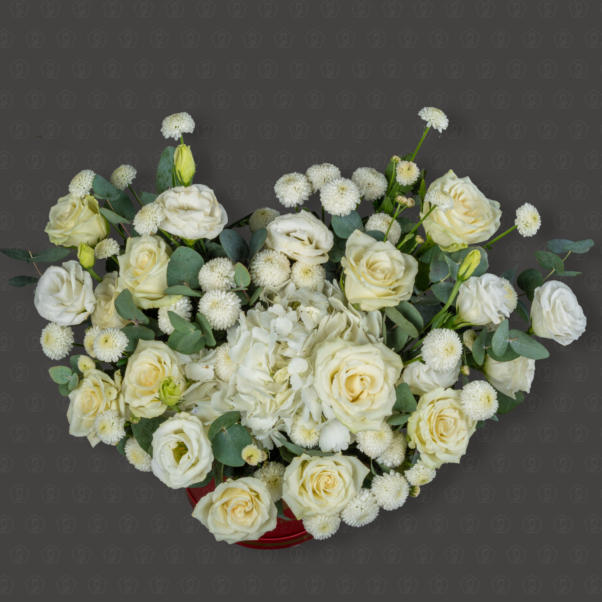 Позвольте себе окунуться в мир изысканной красоты с этой роскошной шляпной коробкой! Здесь вас ждет пленительное сочетание нежной гортензий, трепетных белых роз, утонченной эустомы и воздушных кустовых хризантем – настоящее воплощение элегантности и свежести.