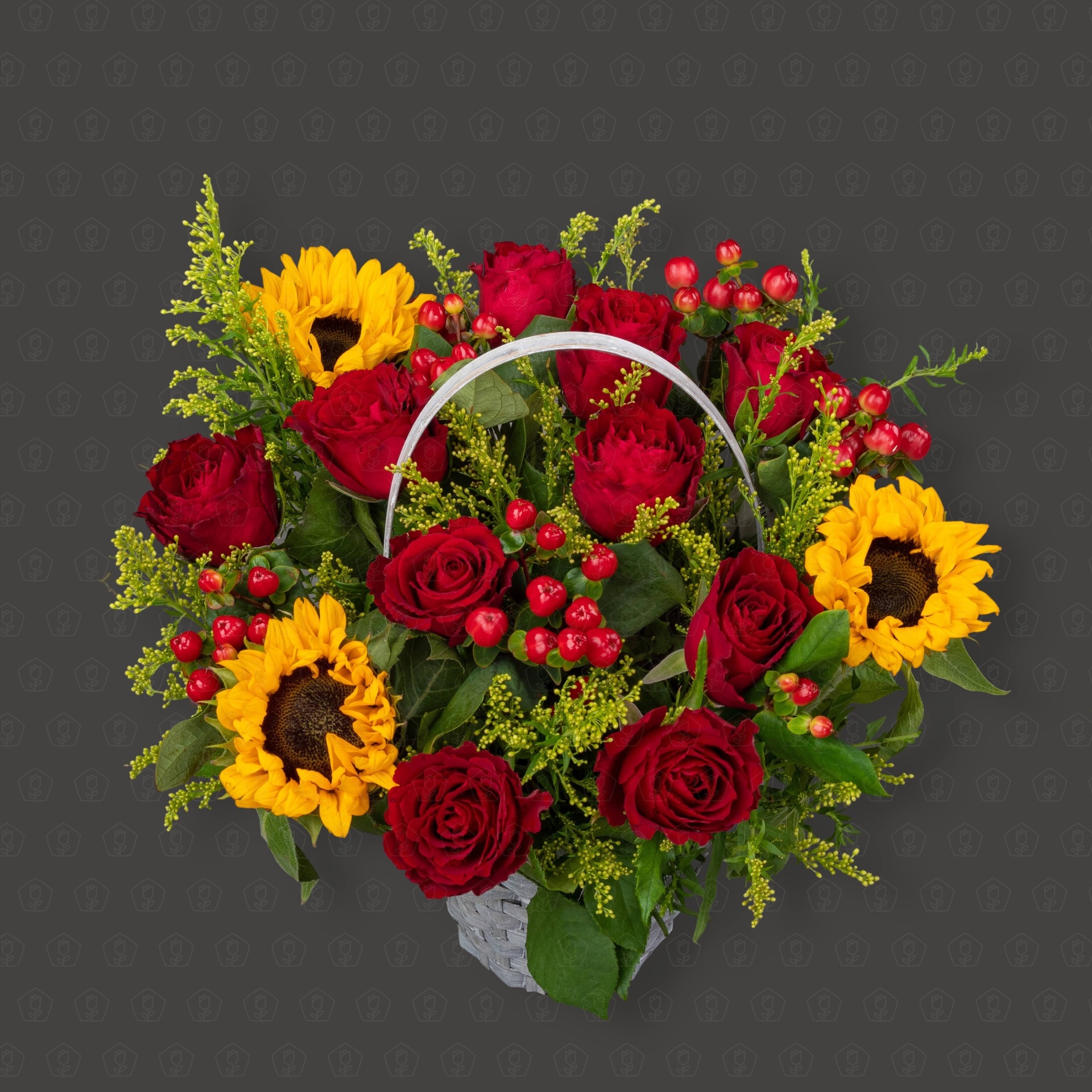 Представьте себе летний день, воплощенный в этой чудесной корзинке! Здесь собрались самые теплые и солнечные цветы: миниатюрные красные розы, словно маленькие сердечки, сияющие подсолнухи, напоминающие о беззаботности, и яркие гроздья красного гиперикума, добавляющие страсти. Легкие веточки солидаго придают композиции воздушность и завершенность. Эта милая корзинка наполнена радостью и теплом, готовая украсить любой дом или стать особенным подарком.